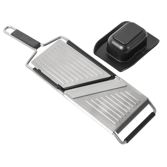 Mit der Mandoline der stilvollen ESSENTIAL-Linie von Kuhn Rikon schneiden Sie problemlos verschiedene Gemüse- und Obstarten wie Kartoffeln, Gurken oder Äpfel. Dank der breiten Klinge und der feinen Rillen an der Schiene gleitet das Schnittgut absolut sauber und präzise. Die extrascharfe Klinge aus Edelstahl ist stufenlos verstellbar, von hauchdünn bis zu einer Stärke von 0.5 cm. Der sichere Fingerschutz lässt Sie selbst Karotten gefahrenfrei bis zum letzten Rest verarbeiten. Die Silikonkante am Fuss verhindert, dass die Reibe auf der Arbeitsfläche wegrutscht und reduziert so die Verletzungsgefahr noch weiter.