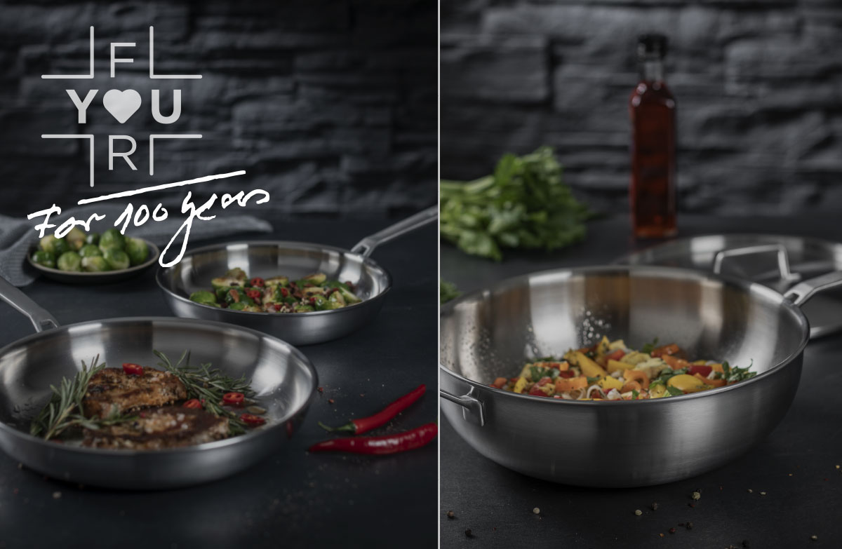 Profi-Performance für ambitioniertes Braten: Das unbeschichtete CULINARY FIVEPLY Bratpfannenset und der passende Wok liefern perfekte Hitzeverteilung und maximale Kontrolle. Premium-Qualität aus Edelstahl – im Juni zum Jubiläumspreis von CHF 100.