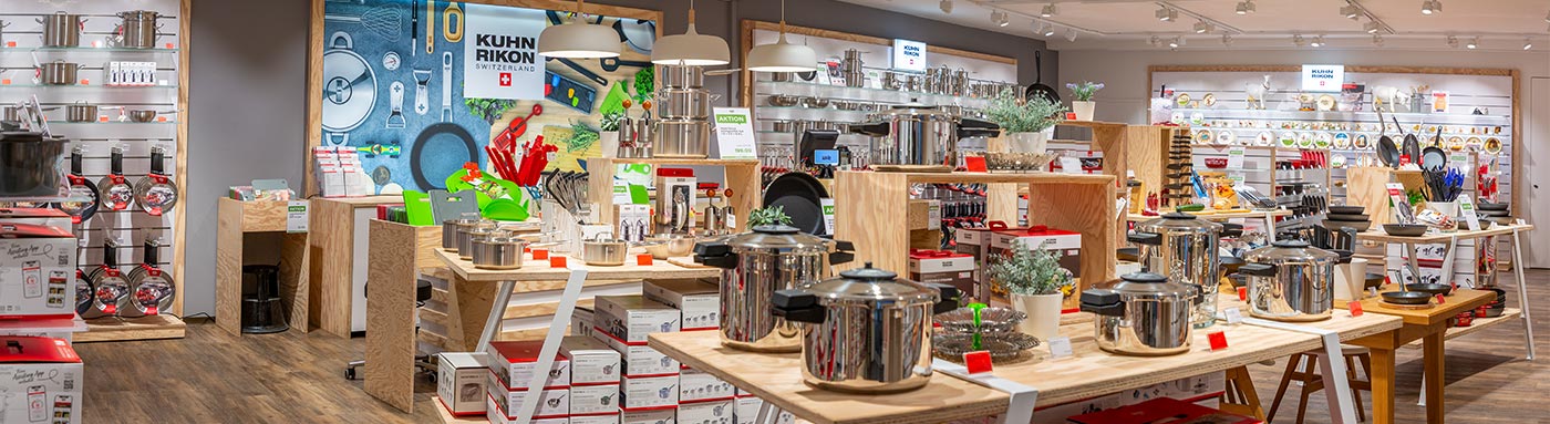 Sur environ 160 m2, le Store présente des poêles, des rôtissoires, des faitouts, des casserolles et d'autres produits de la marque. L'assortiment du Store se concentre fortement sur les produits Swiss Made : par exemple, l'autocuiseur DUROMATIC®, connu et apprécié dans toute la Suisse, qui a été développé et lancé par Jacques Kuhn dès 1949. Mais on trouve également dans le magasin d'autres innovations typiques de Kuhn Rikon, comme le HOTPAN® et le DUROTHERM® à économie d'énergie, les gammes de batteries de cuisine Swiss Made MONTREUX et LOCARNO ou les gammes particulièrement durables NEW LIFE®. Enfin, la vaisselle en céramique de Rheinfelden, peinte à la main de manière artistique et traditionnelle, les accessoires pour fondue et de nombreux autres ustensiles de cuisine utiles sont également proposés à la vente.