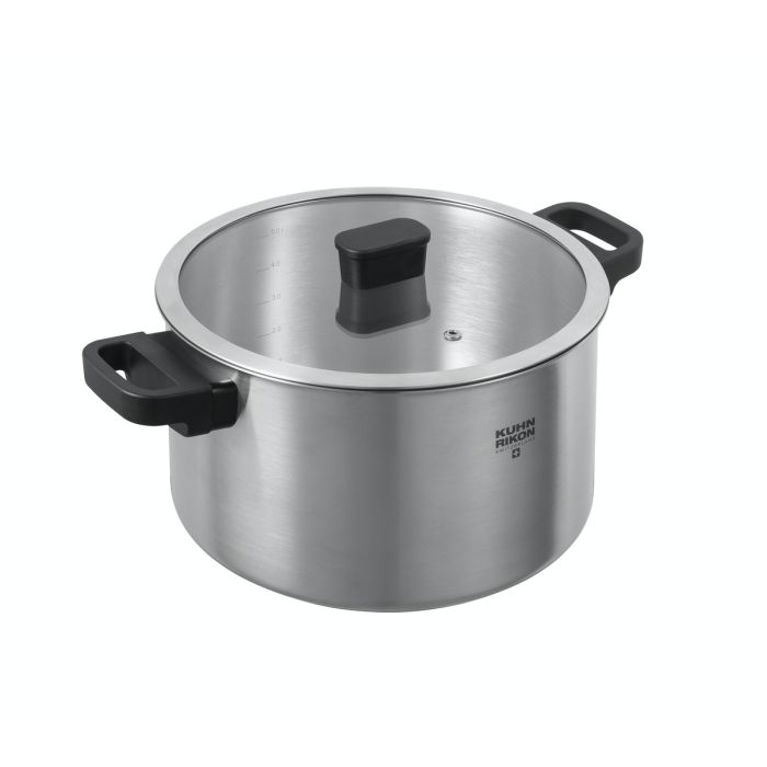 Le couvercle en verre avec son orifice de vapeur permet une cuisson visuelle pratique et empêche le couvercle de coller lors du refroidissement. Le faitout est polyvalent car il convient à tous les types de plaques de cuisson, y compris induction, mais aussi au four (résistant au four jusqu’à 200°C). Le faitout en acier inoxydable robuste et de haute qualité présente une excellente répartition de la chaleur grâce à la base sandwich Superthermic. La poignée ergonomique avec une élégante protection anti-flamme noire tient bien en main et reste agréablement froide. Grâce à la graduation interne des litres, la quantité de liquide peut être mesurée directement dans le faitout - aucun gobelet doseur séparé n'est nécessaire.
