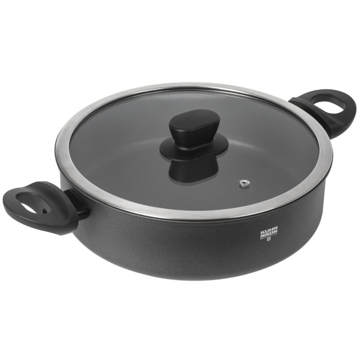 Les poignées latérales ergonomiques en bakélite restent froides même à haute température. Le couvercle en verre avec ouverture pour la vapeur assure une cuisson visuelle confortable et évite les pertes de chaleur inutiles ou le vide. Le nettoyage facile permet d'économiser du temps et de l'eau et constitue un autre avantage agréable de cette poêle à servir de haute qualité.