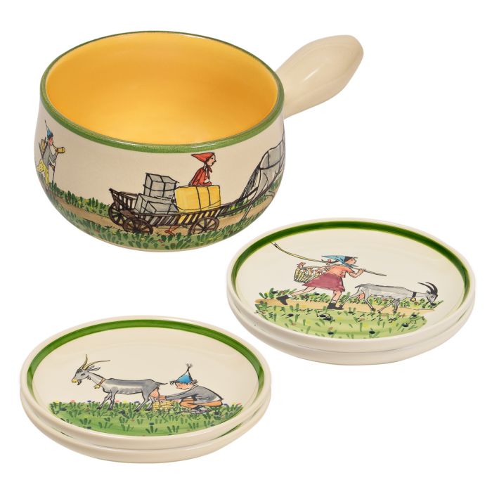 Mit unserem Fondueset Alpaufzug holen Sie sich die unverkennbaren Carigiet-Malereien auf Ihren Fonduetisch.