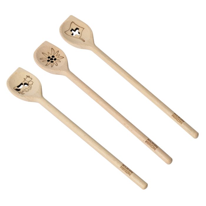 Die Holzkellen aus Buchenholz mit verschiedenen traditionellen Schweizer Sujets sind vielseitig einsetzbar und ideal zum Rühren im Fondue-Caquelon, Kochgeschirr oder Glasschüsseln, ohne antihaftbeschichtetes Kochgeschirr zu zerkratzen.