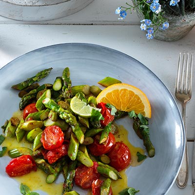 Mezcla los espárragos verdes y los tomates pera en la sartén New Life y prepara una deliciosa ensalada de espárragos y tomates. Con una naranja y una lima, puedes preparar una cremosa vinagreta de naranja. Un fantástico acompañamiento para pescado o marisco a la parrilla.