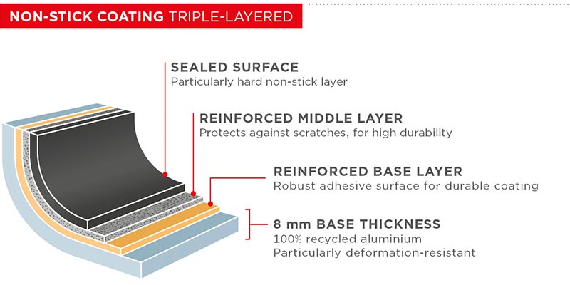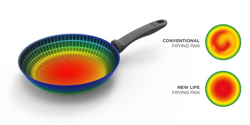 Hasta ahora, la mayoría de las sartenes de aluminio se deformaban fácilmente. Gracias a la nueva tecnología, hemos logrado que el material de la sartén New Life sea más estable y duradero. Este material reciclado de alta calidad es más resistente que el aluminio puro. Pasa por una de nuestras tiendas y coge una sartén New Life. Cuando sientas el peso de esta sartén, te convencerás rápidamente de su durabilidad.