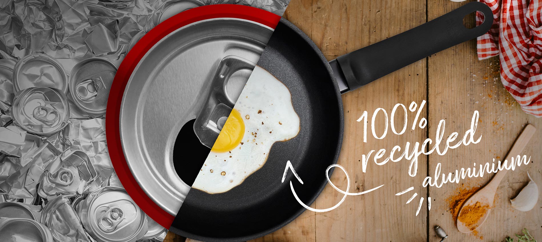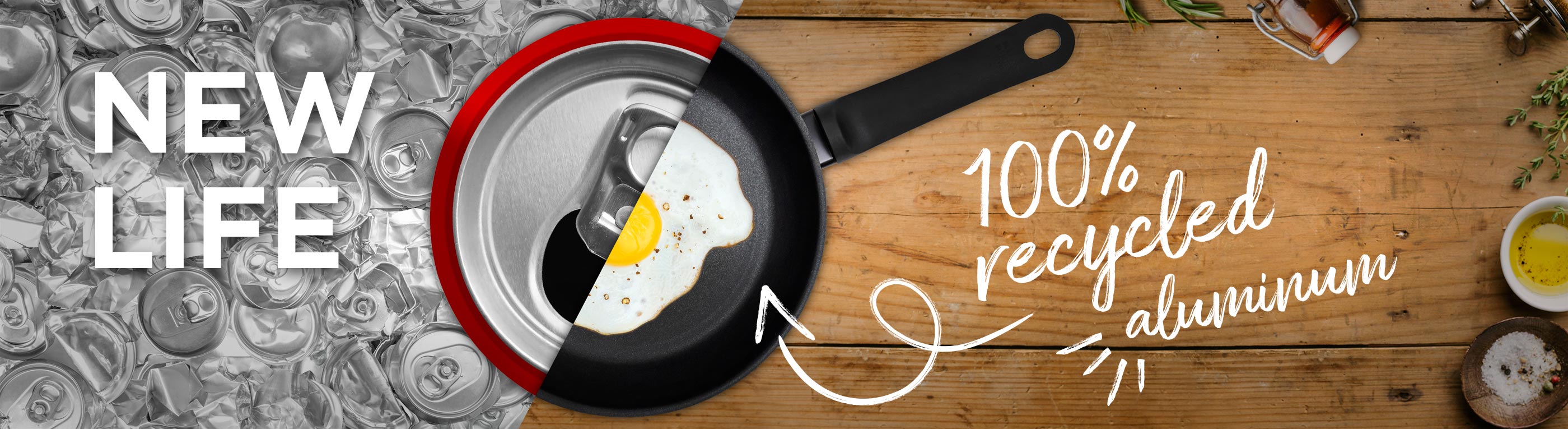 La nueva sartén New Life se compone de un 100% de aluminio reciclado procedente de Europa y está fabricado con un 95 % menos de energía que las sartenes de aluminio convencionales. Para fabricar una sartén, se reciclan alrededor de 30 latas de aluminio (para la sartén New Life de 24 cm). Por lo tanto, como puedes ver, merece la pena recoger las latas del suelo y desecharlas correctamente. Quién sabe, tal vez pronto tengan una segunda vida.