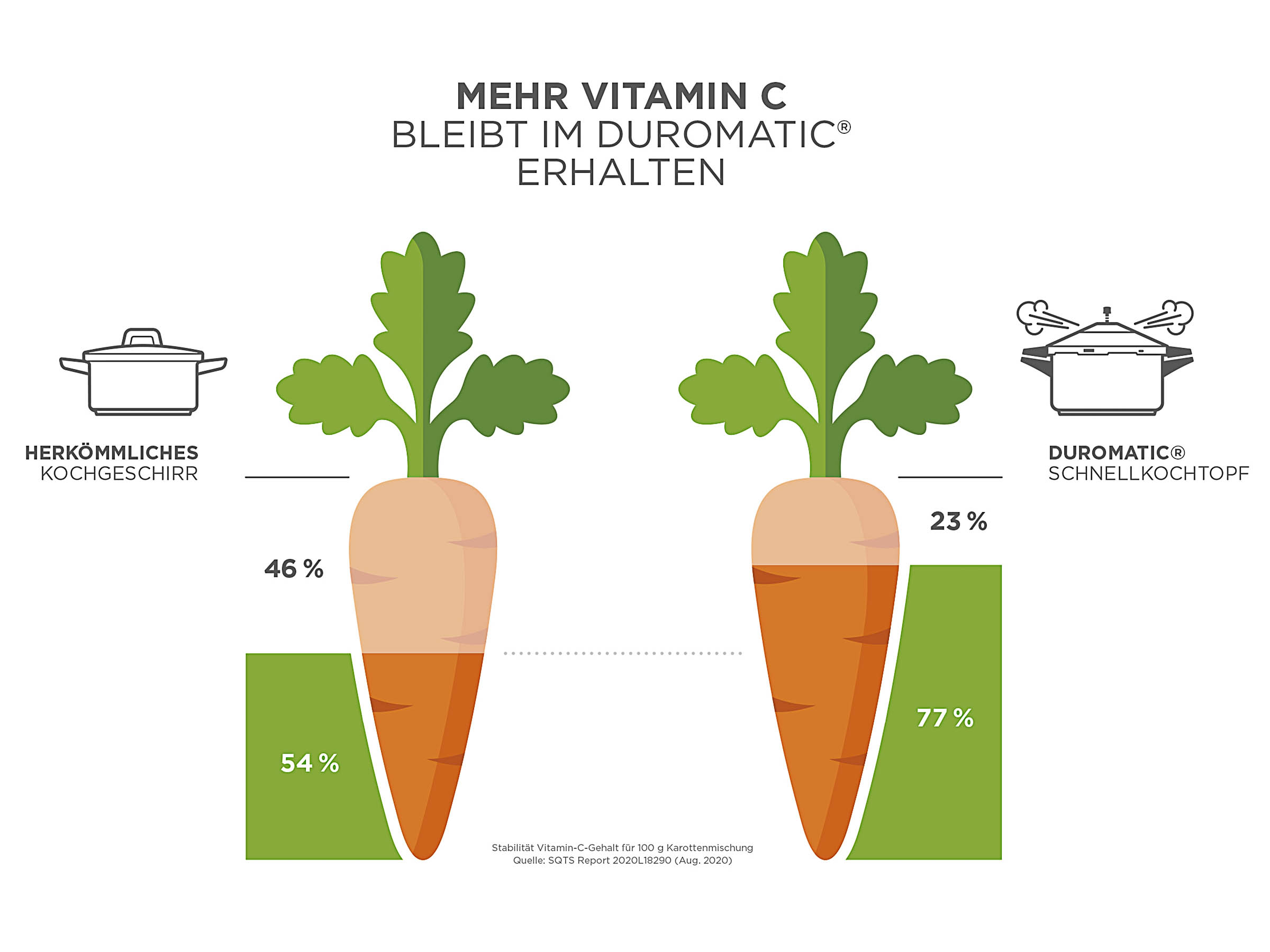 Das Kochen im DUROMATIC® ist bis zu 70 % schneller im Vergleich zu herkömmlichem Kochgeschirr. Dadurch werden Vitamine und Nährstoffe deutlich kürzer hohen Temperaturen ausgesetzt. Auf diese Weise können wichtige Inhaltsstoffe für eine gesunde Ernährung bewahrt werden. Der Siebeinsatz am Boden des DUROMATIC® hilft zudem die Lebensmittel vom Wasser zu trennen, was diesen Effekt verstärkt.