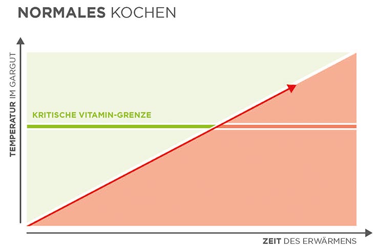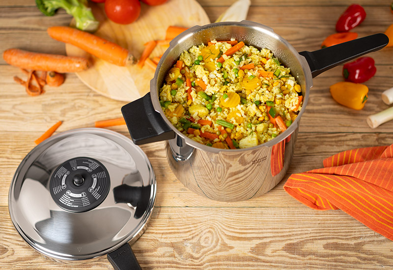 Bei der Zubereitung im Dampfkochtopf wird zum Beispiel doppelt so viel Vitamin C erhalten* wie bei der Zubereitung in herkömmlichem Kochgeschirr. Zusätzlich spart die schnelle Zubereitung im Dampfkochtopf bis zu 70 % Energie.