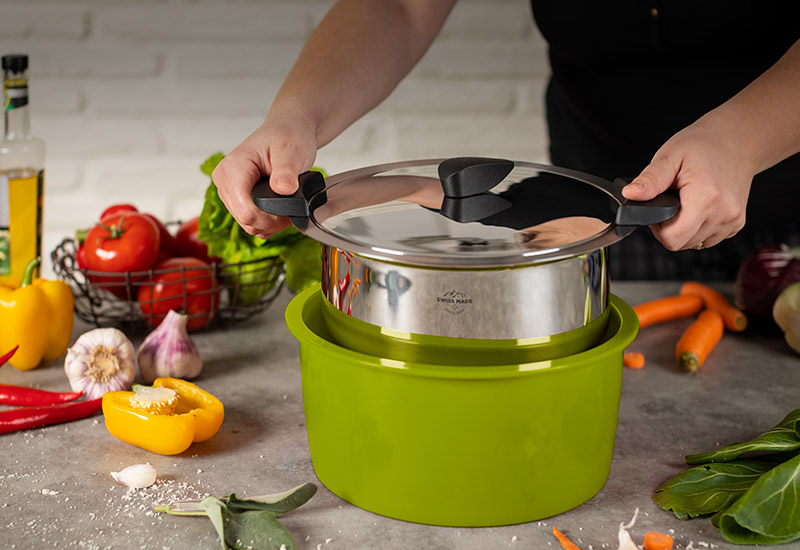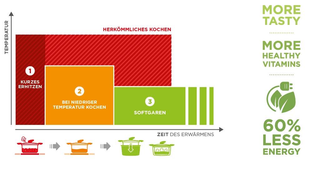 Gesund, nachhaltig und einfach lecker, so kocht man mit dem HOTPAN®. Diese ganz besondere Art der Zubereitung nennen wir SOFTGAREN. Dabei werden die Zutaten nur kurz erhitzt und garen dann ohne zusätzliche Energiezufuhr schonend fertig. Das spart Strom und erhält die wertvollen Vitamine und Nährstoffe im Gargut. Mit dem Softgar-Prozess nimmt man ausserdem etwas Stress aus der Küche und man bekommt Zeit für andere Dinge. Und schonend Gegartes schmeckt einfach besser – das müssen wir ja nicht extra erwähnen.