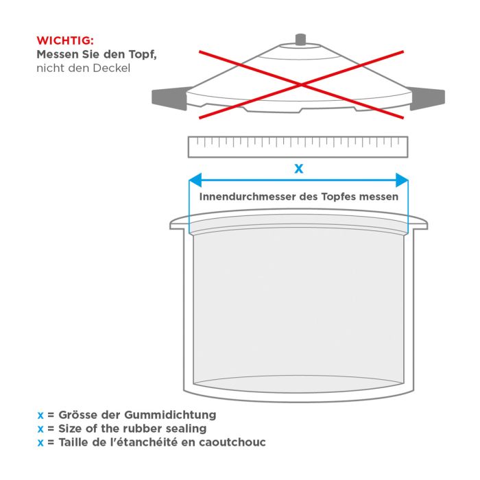 How to find out the correct size of a rubber seal? Measure the inner diameter at the top inner edge of your Duromatic pot. The measured size is the size of the rubber seal needed.